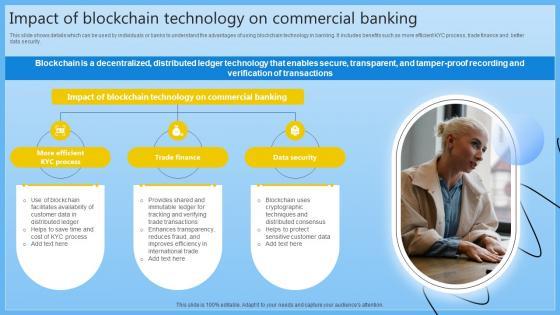 This slide shows details which can be used by individuals or banks to understand the advantages of using blockchain technology in banking. It includes benefits such as more efficient KYC process, trade finance and better data security. Retrieve professionally designed Impact Of Blockchain Technology On Commercial Complete Guide On Managing Banking Fin SS V to effectively convey your message and captivate your listeners. Save time by selecting pre-made slideshows that are appropriate for various topics, from business to educational purposes. These themes come in many different styles, from creative to corporate, and all of them are easily adjustable and can be edited quickly. Access them as PowerPoint templates or as Google Slides themes. You do not have to go on a hunt for the perfect presentation because Slidegeeks got you covered from everywhere. This slide shows details which can be used by individuals or banks to understand the advantages of using blockchain technology in banking. It includes benefits such as more efficient KYC process, trade finance and better data security.