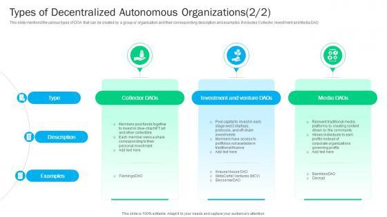 This slide mentions the various types of DOA that can be created by a group or organization and their corresponding description and examples. It includes Protocol. Grants, Philanthropy, Social DAO. Slidegeeks is here to make your presentations a breeze with Blockchain Basics Understanding Types Of Decentralized Autonomous Ppt Example BCT SS V With our easy-to-use and customizable templates, you can focus on delivering your ideas rather than worrying about formatting. With a variety of designs to choose from, you are sure to find one that suits your needs. And with animations and unique photos, illustrations, and fonts, you can make your presentation pop. So whether you are giving a sales pitch or presenting to the board, make sure to check out Slidegeeks first This slide mentions the various types of DOA that can be created by a group or organization and their corresponding description and examples. It includes Protocol. Grants, Philanthropy, Social DAO.