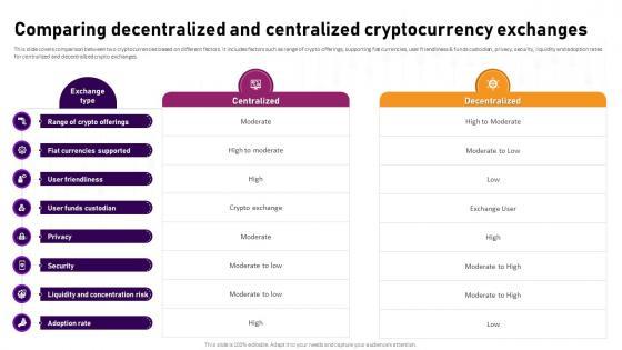 This slide covers comparison between two cryptocurrencies based on different factors. It includes factors such as range of crypto offerings, supporting fiat currencies, user friendliness and funds custodian, privacy, security, liquidity and adoption rates for centralized and decentralized crypto exchanges. Find highly impressive Comparing Decentralized And Centralized Complete Roadmap To Blockchain BCT SS V on Slidegeeks to deliver a meaningful presentation. You can save an ample amount of time using these presentation templates. No need to worry to prepare everything from scratch because Slidegeeks experts have already done a huge research and work for you. You need to download Comparing Decentralized And Centralized Complete Roadmap To Blockchain BCT SS V for your upcoming presentation. All the presentation templates are 100 percent editable and you can change the color and personalize the content accordingly. Download now This slide covers comparison between two cryptocurrencies based on different factors. It includes factors such as range of crypto offerings, supporting fiat currencies, user friendliness and funds custodian, privacy, security, liquidity and adoption rates for centralized and decentralized crypto exchanges.