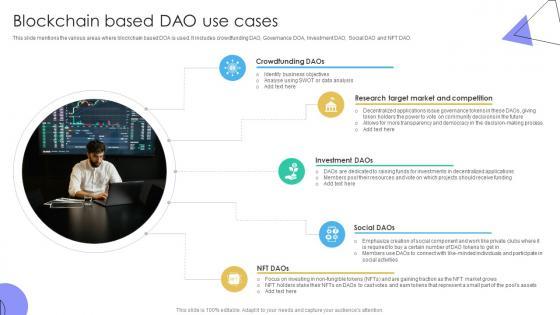 This slide mentions the various areas where blockchain based DOA is used. It includes crowdfunding DAO, Governance DOA, Investment DAO, Social DAO and NFT DAO. Create an editable Guide To Understanding Decentralized Autonomous Blockchain Based DAO Use Cases BCT SS V that communicates your idea and engages your audience. Whether you are presenting a business or an educational presentation, pre-designed presentation templates help save time. Guide To Understanding Decentralized Autonomous Blockchain Based DAO Use Cases BCT SS V is highly customizable and very easy to edit, covering many different styles from creative to business presentations. Slidegeeks has creative team members who have crafted amazing templates. So, go and get them without any delay. This slide mentions the various areas where blockchain based DOA is used. It includes crowdfunding DAO, Governance DOA, Investment DAO, Social DAO and NFT DAO.