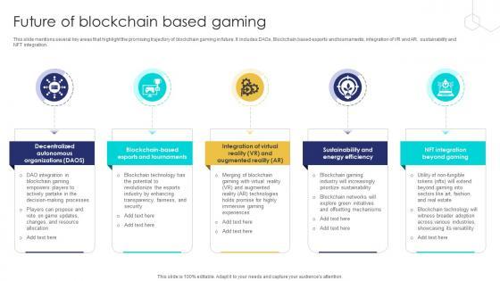 This slide mentions several key areas that highlight the promising trajectory of blockchain gaming in future. It includes DAOs, Blockchain based esports and tournaments, integration of VR and AR, sustainability and NFT integration. The Unlocking The Potential Of Future Of Blockchain Based Gaming BCT SS V is a compilation of the most recent design trends as a series of slides. It is suitable for any subject or industry presentation, containing attractive visuals and photo spots for businesses to clearly express their messages. This template contains a variety of slides for the user to input data, such as structures to contrast two elements, bullet points, and slides for written information. Slidegeeks is prepared to create an impression. This slide mentions several key areas that highlight the promising trajectory of blockchain gaming in future. It includes DAOs, Blockchain based esports and tournaments, integration of VR and AR, sustainability and NFT integration.