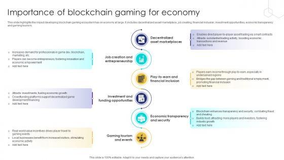 This slide highlights the impact developing blockchain gaming ecosystem has on economy at large. It includes decentralized asset marketplace, job creating, financial inclusion, investment opportunities, economic transparency and gaming tourism. Want to ace your presentation in front of a live audience Our Unlocking The Potential Of Importance Of Blockchain Gaming For Economy BCT SS V can help you do that by engaging all the users towards you. Slidegeeks experts have put their efforts and expertise into creating these impeccable powerpoint presentations so that you can communicate your ideas clearly. Moreover, all the templates are customizable, and easy-to-edit and downloadable. Use these for both personal and commercial use. This slide highlights the impact developing blockchain gaming ecosystem has on economy at large. It includes decentralized asset marketplace, job creating, financial inclusion, investment opportunities, economic transparency and gaming tourism.