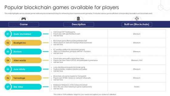 This slide highlights various popular games built using blockchain technology for enhancing player experience and gameplay. It includes various games with their corresponding description and blockchain used. Make sure to capture your audiences attention in your business displays with our gratis customizable Unlocking The Potential Of Popular Blockchain Games Available For Players BCT SS V. These are great for business strategies, office conferences, capital raising or task suggestions. If you desire to acquire more customers for your tech business and ensure they stay satisfied, create your own sales presentation with these plain slides. This slide highlights various popular games built using blockchain technology for enhancing player experience and gameplay. It includes various games with their corresponding description and blockchain used.