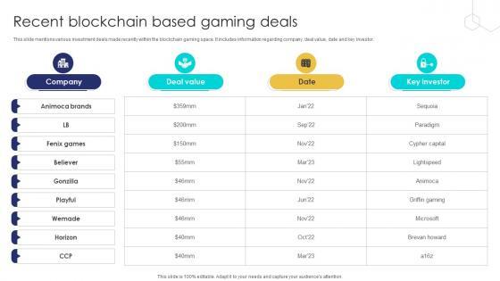 This slide mentions various investment deals made recently within the blockchain gaming space. It includes information regarding company, deal value, date and key investor. Coming up with a presentation necessitates that the majority of the effort goes into the content and the message you intend to convey. The visuals of a PowerPoint presentation can only be effective if it supplements and supports the story that is being told. Keeping this in mind our experts created Unlocking The Potential Of Recent Blockchain Based Gaming Deals BCT SS V to reduce the time that goes into designing the presentation. This way, you can concentrate on the message while our designers take care of providing you with the right template for the situation. This slide mentions various investment deals made recently within the blockchain gaming space. It includes information regarding company, deal value, date and key investor.