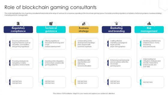 This slide highlights the role of gaming consultants that provide wide range of services to companies operating in the blockchain gaming space. It includes providing regulatory compliance, technical guidance, business strategy, marketing and risk management. This Unlocking The Potential Of Role Of Blockchain Gaming Consultants BCT SS V is perfect for any presentation, be it in front of clients or colleagues. It is a versatile and stylish solution for organizing your meetings. The Unlocking The Potential Of Role Of Blockchain Gaming Consultants BCT SS V features a modern design for your presentation meetings. The adjustable and customizable slides provide unlimited possibilities for acing up your presentation. Slidegeeks has done all the homework before launching the product for you. So, do not wait, grab the presentation templates today This slide highlights the role of gaming consultants that provide wide range of services to companies operating in the blockchain gaming space. It includes providing regulatory compliance, technical guidance, business strategy, marketing and risk management.