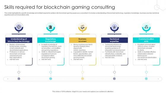 This slide highlights the specific knowledge and skillset required to venture into blockchain gaming space as a consultant. It includes understanding of blockchain technology, regulatory knowledge, business acumen, technical expertise and communication skills. The best PPT templates are a great way to save time, energy, and resources. Slidegeeks have 100 percent editable powerpoint slides making them incredibly versatile. With these quality presentation templates, you can create a captivating and memorable presentation by combining visually appealing slides and effectively communicating your message. Download Unlocking The Potential Of Skills Required For Blockchain Gaming Consulting BCT SS V from Slidegeeks and deliver a wonderful presentation. This slide highlights the specific knowledge and skillset required to venture into blockchain gaming space as a consultant. It includes understanding of blockchain technology, regulatory knowledge, business acumen, technical expertise and communication skills.