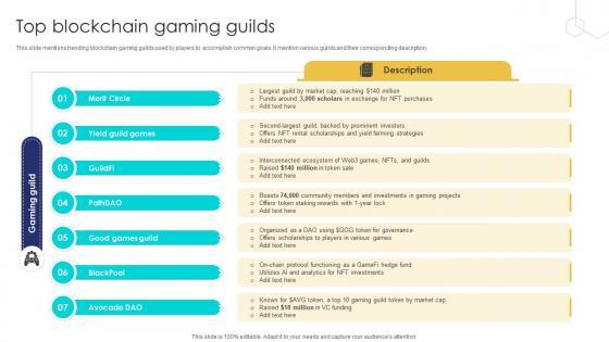 This slide mentions trending blockchain gaming guilds used by players to accomplish common goals. It mention various guilds and their corresponding description. Slidegeeks has constructed Unlocking The Potential Of Top Blockchain Gaming Guilds BCT SS V after conducting extensive research and examination. These presentation templates are constantly being generated and modified based on user preferences and critiques from editors. Here, you will find the most attractive templates for a range of purposes while taking into account ratings and remarks from users regarding the content. This is an excellent jumping-off point to explore our content and will give new users an insight into our top-notch PowerPoint Templates. This slide mentions trending blockchain gaming guilds used by players to accomplish common goals. It mention various guilds and their corresponding description.