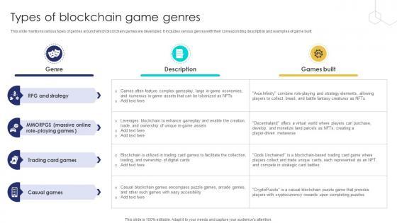 This slide mentions various types of genres around which blockchain games are developed. It includes various genres with their corresponding description and examples of game built. Here you can discover an assortment of the finest PowerPoint and Google Slides templates. With these templates, you can create presentations for a variety of purposes while simultaneously providing your audience with an eye-catching visual experience. Download Unlocking The Potential Of Types Of Blockchain Game Genres BCT SS V to deliver an impeccable presentation. These templates will make your job of preparing presentations much quicker, yet still, maintain a high level of quality. Slidegeeks has experienced researchers who prepare these templates and write high-quality content for you. Later on, you can personalize the content by editing the Unlocking The Potential Of Types Of Blockchain Game Genres BCT SS V. This slide mentions various types of genres around which blockchain games are developed. It includes various genres with their corresponding description and examples of game built.