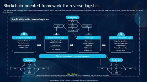 This slide represents framework which can guide manufacturers to perform reverse logistics from blockchain technology. It provides information about company layer, blockchain layer, supplier, logistics info, asset info, block hash, time stamp, etc. Do you have an important presentation coming up Are you looking for something that will make your presentation stand out from the rest Look no further than Blockchain Oriented Framework For Reverse Logistics Blockchain Transportation Designs Pdf. With our professional designs, you can trust that your presentation will pop and make delivering it a smooth process. And with Slidegeeks, you can trust that your presentation will be unique and memorable. So why wait Grab Blockchain Oriented Framework For Reverse Logistics Blockchain Transportation Designs Pdf today and make your presentation stand out from the rest This slide represents framework which can guide manufacturers to perform reverse logistics from blockchain technology. It provides information about company layer, blockchain layer, supplier, logistics info, asset info, block hash, time stamp, etc.