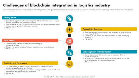 This slide mentions various issues encountered when integrating blockchain with logistics management systems. Key issues include privacy issues, accessibility concerns, staff training, data integration and scalability concerns. Explore a selection of the finest Challenges Of Blockchain Integration In Logistics Supply Chain Evolution Harnessing The Power BCT SS V here. With a plethora of professionally designed and pre-made slide templates, you can quickly and easily find the right one for your upcoming presentation. You can use our Challenges Of Blockchain Integration In Logistics Supply Chain Evolution Harnessing The Power BCT SS V to effectively convey your message to a wider audience. Slidegeeks has done a lot of research before preparing these presentation templates. The content can be personalized and the slides are highly editable. Grab templates today from Slidegeeks. This slide mentions various issues encountered when integrating blockchain with logistics management systems. Key issues include privacy issues, accessibility concerns, staff training, data integration and scalability concerns.