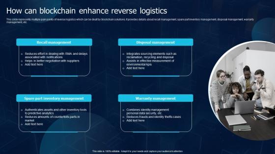 This slide represents multiple pain points of reverse logistics which can be dealt by blockchain solutions. It provides details about recall management, spare part inventory management, disposal management, warranty management, etc. If you are looking for a format to display your unique thoughts, then the professionally designed How Can Blockchain Enhance Reverse Logistics Blockchain Transportation Topics Pdf is the one for you. You can use it as a Google Slides template or a PowerPoint template. Incorporate impressive visuals, symbols, images, and other charts. Modify or reorganize the text boxes as you desire. Experiment with shade schemes and font pairings. Alter, share or cooperate with other people on your work. Download How Can Blockchain Enhance Reverse Logistics Blockchain Transportation Topics Pdf and find out how to give a successful presentation. Present a perfect display to your team and make your presentation unforgettable. This slide represents multiple pain points of reverse logistics which can be dealt by blockchain solutions. It provides details about recall management, spare part inventory management, disposal management, warranty management, etc.
