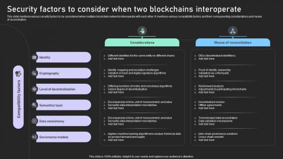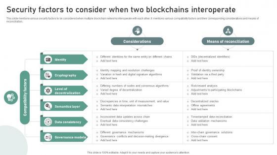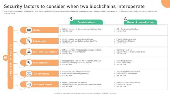 This slide mentions various security factors to be considered when multiple blockchain networks interoperate with each other. It mentions various compatibility factors and their corresponding considerations and means of reconciliation. Create an editable Bridging Blockchains A Deep Security Factors To Consider When Two Blockchains BCT SS V that communicates your idea and engages your audience. Whether you are presenting a business or an educational presentation, pre-designed presentation templates help save time. Bridging Blockchains A Deep Security Factors To Consider When Two Blockchains BCT SS V is highly customizable and very easy to edit, covering many different styles from creative to business presentations. Slidegeeks has creative team members who have crafted amazing templates. So, go and get them without any delay. This slide mentions various security factors to be considered when multiple blockchain networks interoperate with each other. It mentions various compatibility factors and their corresponding considerations and means of reconciliation.