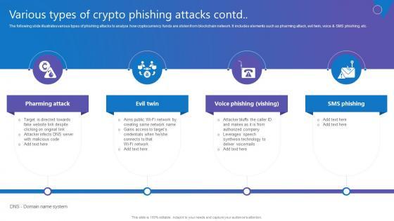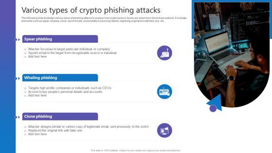 The following slide illustrates various types of phishing attacks to analyze how cryptocurrency funds are stolen from blockchain network. It includes elements such as spear, whaling, clone, spoof emails, accessibility to personal details, replacing original link with fake one, etc. qDo you have to make sure that everyone on your team knows about any specific topic I yes, then you should give Various Types Of Crypto Comprehensive Guide To Blockchain Digital Security Clipart Pdf a try. Our experts have put a lot of knowledge and effort into creating this impeccable Various Types Of Crypto Comprehensive Guide To Blockchain Digital Security Clipart Pdf. You can use this template for your upcoming presentations, as the slides are perfect to represent even the tiniest detail. You can download these templates from the Slidegeeks website and these are easy to edit. So grab these today The following slide illustrates various types of phishing attacks to analyze how cryptocurrency funds are stolen from blockchain network. It includes elements such as spear, whaling, clone, spoof emails, accessibility to personal details, replacing original link with fake one, etc.