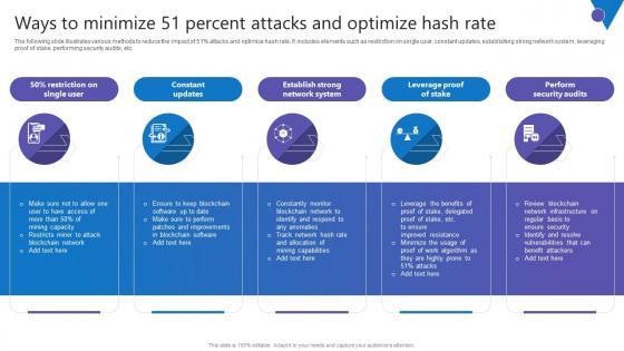 The following slide illustrates various methods to reduce the impact of 51percent attacks and optimize hash rate. It includes elements such as restriction on single user, constant updates, establishing strong network system, leveraging proof of stake, performing security audits, etc. Present like a pro with Ways To Minimize 51 Percent Comprehensive Guide To Blockchain Digital Security Ideas Pdf Create beautiful presentations together with your team, using our easy to use presentation slides. Share your ideas in real time and make changes on the fly by downloading our templates. So whether you are in the office, on the go, or in a remote location, you can stay in sync with your team and present your ideas with confidence. With Slidegeeks presentation got a whole lot easier. Grab these presentations today. The following slide illustrates various methods to reduce the impact of 51percent attacks and optimize hash rate. It includes elements such as restriction on single user, constant updates, establishing strong network system, leveraging proof of stake, performing security audits, etc.