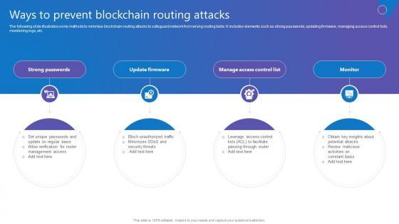 The following slide illustrates some methods to minimize blockchain routing attacks to safeguard network from wrong routing table. It includes elements such as strong passwords, updating firmware, managing access control lists, monitoring logs, etc. Slidegeeks is here to make your presentations a breeze with Ways To Prevent Blockchain Comprehensive Guide To Blockchain Digital Security Icons Pdf With our easy to use and customizable templates, you can focus on delivering your ideas rather than worrying about formatting. With a variety of designs to choose from, you are sure to find one that suits your needs. And with animations and unique photos, illustrations, and fonts, you can make your presentation pop. So whether you are giving a sales pitch or presenting to the board, make sure to check out Slidegeeks first The following slide illustrates some methods to minimize blockchain routing attacks to safeguard network from wrong routing table. It includes elements such as strong passwords, updating firmware, managing access control lists, monitoring logs, etc.