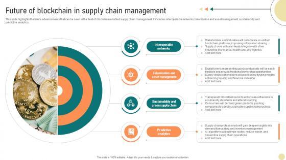 This slide highlights the future advancements that can be seen in the field of blockchain enabled supply chain management. It includes interoperable networks, tokenization and asset management, sustainability and predictive analytics. Find a pre-designed and impeccable A116 Visionary Guide To Blockchain Technologys Future Of Blockchain In Supply Chain BCT SS V. The templates can ace your presentation without additional effort. You can download these easy-to-edit presentation templates to make your presentation stand out from others. So, what are you waiting for Download the template from Slidegeeks today and give a unique touch to your presentation. This slide highlights the future advancements that can be seen in the field of blockchain enabled supply chain management. It includes interoperable networks, tokenization and asset management, sustainability and predictive analytics.