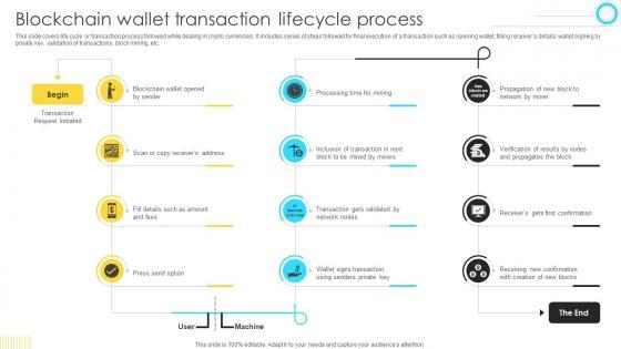 This slide covers life cycle or transaction process followed while dealing in crypto currencies. It includes series of steps followed for final execution of a transaction such as opening wallet, filling receivers details, wallet signing by private key, validation of transactions, block mining, etc. Slidegeeks is here to make your presentations a breeze with Mastering Blockchain Wallets Blockchain Wallet Transaction Lifecycle Process BCT SS V With our easy-to-use and customizable templates, you can focus on delivering your ideas rather than worrying about formatting. With a variety of designs to choose from, you are sure to find one that suits your needs. And with animations and unique photos, illustrations, and fonts, you can make your presentation pop. So whether you are giving a sales pitch or presenting to the board, make sure to check out Slidegeeks first This slide covers life cycle or transaction process followed while dealing in crypto currencies. It includes series of steps followed for final execution of a transaction such as opening wallet, filling receivers details, wallet signing by private key, validation of transactions, block mining, etc.