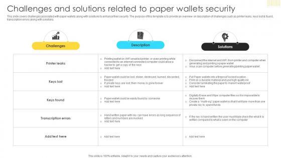 This slide covers challenges associated with paper wallets along with solutions to enhance their security. The purpose of this template is to provide an overview on description of challenges such as printer leaks, keys lost and found, transcription errors along with solutions. Whether you have daily or monthly meetings, a brilliant presentation is necessary. Mastering Blockchain Wallets Challenges And Solutions Related To Paper Wallets BCT SS V can be your best option for delivering a presentation. Represent everything in detail using Mastering Blockchain Wallets Challenges And Solutions Related To Paper Wallets BCT SS V and make yourself stand out in meetings. The template is versatile and follows a structure that will cater to your requirements. All the templates prepared by Slidegeeks are easy to download and edit. Our research experts have taken care of the corporate themes as well. So, give it a try and see the results. This slide covers challenges associated with paper wallets along with solutions to enhance their security. The purpose of this template is to provide an overview on description of challenges such as printer leaks, keys lost and found, transcription errors along with solutions.