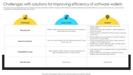 This slide covers issues highlighting common challenges associated with software wallets. The purpose of this template is to potential solutions to enhance their efficiency for risks such as security risks, user error and loss, compatibility issues along with description and solutions. Find highly impressive Mastering Blockchain Wallets Challenges With Solutions For Improving Efficiency BCT SS V on Slidegeeks to deliver a meaningful presentation. You can save an ample amount of time using these presentation templates. No need to worry to prepare everything from scratch because Slidegeeks experts have already done a huge research and work for you. You need to download Mastering Blockchain Wallets Challenges With Solutions For Improving Efficiency BCT SS V for your upcoming presentation. All the presentation templates are 100 percent editable and you can change the color and personalize the content accordingly. Download now This slide covers issues highlighting common challenges associated with software wallets. The purpose of this template is to potential solutions to enhance their efficiency for risks such as security risks, user error and loss, compatibility issues along with description and solutions.