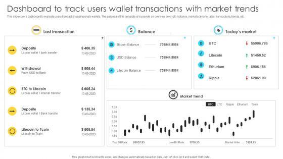 This slide covers dashboard to evaluate users transactions using crypto wallets. The purpose of this template is to provide an overview on crypto balance, market scenario, latest transactions, trends, etc. Welcome to our selection of the Mastering Blockchain Wallets Dashboard To Track Users Wallet Transactions BCT SS V. These are designed to help you showcase your creativity and bring your sphere to life. Planning and Innovation are essential for any business that is just starting out. This collection contains the designs that you need for your everyday presentations. All of our PowerPoints are 100Percent editable, so you can customize them to suit your needs. This multi-purpose template can be used in various situations. Grab these presentation templates today. This slide covers dashboard to evaluate users transactions using crypto wallets. The purpose of this template is to provide an overview on crypto balance, market scenario, latest transactions, trends, etc.