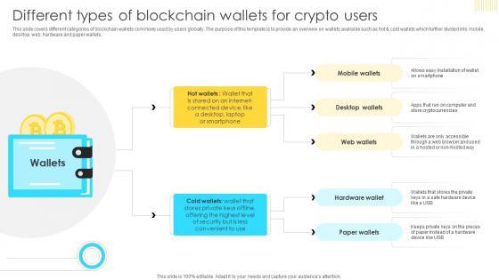 This slide covers different categories of blockchain wallets commonly used by users globally. The purpose of this template is to provide an overview on wallets available such as hot and cold wallets which further divided into mobile, desktop, web, hardware and paper wallets. The Mastering Blockchain Wallets Different Types Of Blockchain Wallets For Crypto BCT SS V is a compilation of the most recent design trends as a series of slides. It is suitable for any subject or industry presentation, containing attractive visuals and photo spots for businesses to clearly express their messages. This template contains a variety of slides for the user to input data, such as structures to contrast two elements, bullet points, and slides for written information. Slidegeeks is prepared to create an impression. This slide covers different categories of blockchain wallets commonly used by users globally. The purpose of this template is to provide an overview on wallets available such as hot and cold wallets which further divided into mobile, desktop, web, hardware and paper wallets.