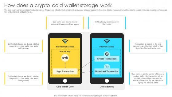 This slide covers working process of cold wallet storage. The purpose of this template is to provide an overview on guide to perform steps in an effective manner with or without internet access. It includes elements such as private key, cold wallet core, cold gateway, etc. Here you can discover an assortment of the finest PowerPoint and Google Slides templates. With these templates, you can create presentations for a variety of purposes while simultaneously providing your audience with an eye-catching visual experience. Download Mastering Blockchain Wallets How Does A Crypto Cold Wallet Storage Work BCT SS V to deliver an impeccable presentation. These templates will make your job of preparing presentations much quicker, yet still, maintain a high level of quality. Slidegeeks has experienced researchers who prepare these templates and write high-quality content for you. Later on, you can personalize the content by editing the Mastering Blockchain Wallets How Does A Crypto Cold Wallet Storage Work BCT SS V. This slide covers working process of cold wallet storage. The purpose of this template is to provide an overview on guide to perform steps in an effective manner with or without internet access. It includes elements such as private key, cold wallet core, cold gateway, etc.