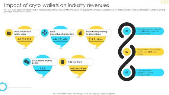 This slide covers impact of blockchain wallets in managing and generating revenues for different industries. The purpose of this template is to provide an overview on total blockchain wallet users, transactions, worldwide spending, percentage of bitcoin owned by FBI,etc. Take your projects to the next level with our ultimate collection of Mastering Blockchain Wallets Impact Of Cryto Wallets On Industry Revenues BCT SS V. Slidegeeks has designed a range of layouts that are perfect for representing task or activity duration, keeping track of all your deadlines at a glance. Tailor these designs to your exact needs and give them a truly corporate look with your own brand colors they will make your projects stand out from the rest This slide covers impact of blockchain wallets in managing and generating revenues for different industries. The purpose of this template is to provide an overview on total blockchain wallet users, transactions, worldwide spending, percentage of bitcoin owned by FBI,etc.