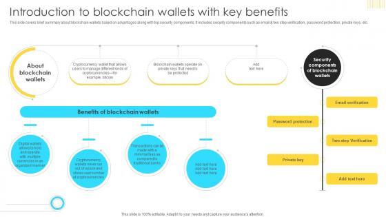 This side covers brief summary about blockchain wallets based on advantages along with top security components. It includes security components such as email and two step verification, password protection, private keys, etc Do you know about Slidesgeeks Mastering Blockchain Wallets Introduction To Blockchain Wallets With Key BCT SS V These are perfect for delivering any kind od presentation. Using it, create PowerPoint presentations that communicate your ideas and engage audiences. Save time and effort by using our pre-designed presentation templates that are perfect for a wide range of topic. Our vast selection of designs covers a range of styles, from creative to business, and are all highly customizable and easy to edit. Download as a PowerPoint template or use them as Google Slides themes. This side covers brief summary about blockchain wallets based on advantages along with top security components. It includes security components such as email and two step verification, password protection, private keys, etc