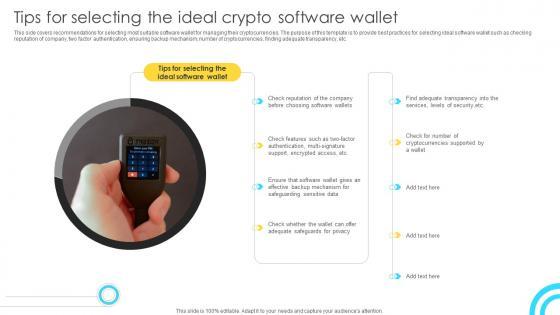 This side covers recommendations for selecting most suitable software wallet for managing their cryptocurrencies. The purpose of this template is to provide best practices for selecting ideal software wallet such as checking reputation of company, two factor authentication, ensuring backup mechanism, number of cryptocurrencies, finding adequate transparency, etc. Explore a selection of the finest Mastering Blockchain Wallets Tips For Selecting The Ideal Crypto Software Wallet BCT SS V here. With a plethora of professionally designed and pre-made slide templates, you can quickly and easily find the right one for your upcoming presentation. You can use our Mastering Blockchain Wallets Tips For Selecting The Ideal Crypto Software Wallet BCT SS V to effectively convey your message to a wider audience. Slidegeeks has done a lot of research before preparing these presentation templates. The content can be personalized and the slides are highly editable. Grab templates today from Slidegeeks. This side covers recommendations for selecting most suitable software wallet for managing their cryptocurrencies. The purpose of this template is to provide best practices for selecting ideal software wallet such as checking reputation of company, two factor authentication, ensuring backup mechanism, number of cryptocurrencies, finding adequate transparency, etc.