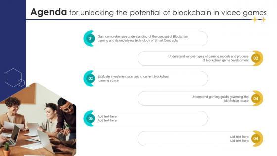 Find a pre-designed and impeccable Agenda For Unlocking The Potential Of Blockchain In Video Games BCT SS V. The templates can ace your presentation without additional effort. You can download these easy-to-edit presentation templates to make your presentation stand out from others. So, what are you waiting for Download the template from Slidegeeks today and give a unique touch to your presentation. Our Agenda For Unlocking The Potential Of Blockchain In Video Games BCT SS V are topically designed to provide an attractive backdrop to any subject. Use them to look like a presentation pro.