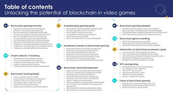 Slidegeeks is one of the best resources for PowerPoint templates. You can download easily and regulate Table Of Contents Unlocking The Potential Of Blockchain In Video Games BCT SS V for your personal presentations from our wonderful collection. A few clicks is all it takes to discover and get the most relevant and appropriate templates. Use our Templates to add a unique zing and appeal to your presentation and meetings. All the slides are easy to edit and you can use them even for advertisement purposes. Our Table Of Contents Unlocking The Potential Of Blockchain In Video Games BCT SS V are topically designed to provide an attractive backdrop to any subject. Use them to look like a presentation pro.