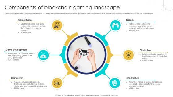 This slide mentions various components that constitute a part of blockchain gaming landscape. It includes games, distribution, infrastructure, community, game development, data analytics and game studios. This modern and well-arranged Unlocking The Potential Of Components Of Blockchain Gaming Landscape BCT SS V provides lots of creative possibilities. It is very simple to customize and edit with the Powerpoint Software. Just drag and drop your pictures into the shapes. All facets of this template can be edited with Powerpoint, no extra software is necessary. Add your own material, put your images in the places assigned for them, adjust the colors, and then you can show your slides to the world, with an animated slide included. This slide mentions various components that constitute a part of blockchain gaming landscape. It includes games, distribution, infrastructure, community, game development, data analytics and game studios.