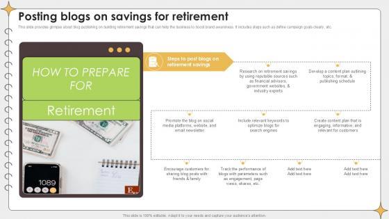This slide provides glimpse about blog publishing on building retirement savings that can help the business to boost brand awareness. It includes steps such as define campaign goals clearly, etc. Presenting this PowerPoint presentation, titled Posting Blogs On Savings Marketing Plan For Boosting Client Retention In Retail Banking Rules Pdf, with topics curated by our researchers after extensive research. This editable presentation is available for immediate download and provides attractive features when used. Download now and captivate your audience. Presenting this Posting Blogs On Savings Marketing Plan For Boosting Client Retention In Retail Banking Rules Pdf. Our researchers have carefully researched and created these slides with all aspects taken into consideration. This is a completely customizable Posting Blogs On Savings Marketing Plan For Boosting Client Retention In Retail Banking Rules Pdf that is available for immediate downloading. Download now and make an impact on your audience. Highlight the attractive features available with our PPTs. This slide provides glimpse about blog publishing on building retirement savings that can help the business to boost brand awareness. It includes steps such as define campaign goals clearly, etc.