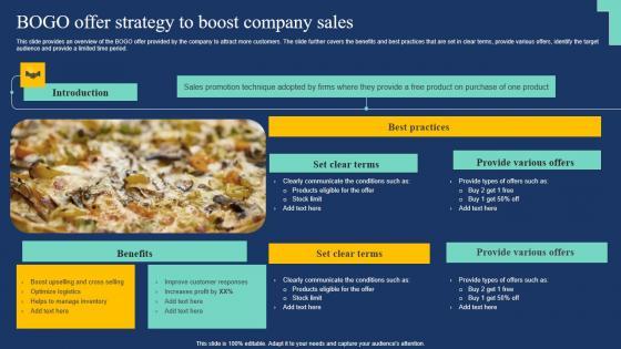 This slide provides an overview of the BOGO offer provided by the company to attract more customers. The slide further covers the benefits and best practices that are set in clear terms, provide various offers, identify the target audience and provide a limited time period. Coming up with a presentation necessitates that the majority of the effort goes into the content and the message you intend to convey. The visuals of a PowerPoint presentation can only be effective if it supplements and supports the story that is being told. Keeping this in mind our experts created Leveraging Market Penetration For Increased Awareness Bogo Offer Strategy To Boost Company Slides PDF to reduce the time that goes into designing the presentation. This way, you can concentrate on the message while our designers take care of providing you with the right template for the situation.
