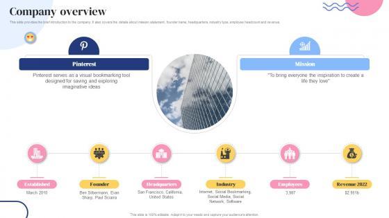 This slide provides the brief introduction to the company. It also covers the details about mission statement, founder name, headquarters, industry type, employee headcount and revenue. Boost your pitch with our creative Company Overview Social Bookmarking Platform Business Model BMC SS V. Deliver an awe-inspiring pitch that will mesmerize everyone. Using these presentation templates you will surely catch everyones attention. You can browse the ppts collection on our website. We have researchers who are experts at creating the right content for the templates. So you do not have to invest time in any additional work. Just grab the template now and use them. This slide provides the brief introduction to the company. It also covers the details about mission statement, founder name, headquarters, industry type, employee headcount and revenue.