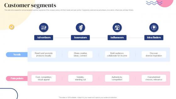 This slide showcases the various targeted customer segments of the company along with their needs and pain points. It segments customers as advertisers, innovators, influencers, and idea finders. Want to ace your presentation in front of a live audience Our Customer Segments Social Bookmarking Platform Business Model BMC SS V can help you do that by engaging all the users towards you. Slidegeeks experts have put their efforts and expertise into creating these impeccable powerpoint presentations so that you can communicate your ideas clearly. Moreover, all the templates are customizable, and easy-to-edit and downloadable. Use these for both personal and commercial use. This slide showcases the various targeted customer segments of the company along with their needs and pain points. It segments customers as advertisers, innovators, influencers, and idea finders.