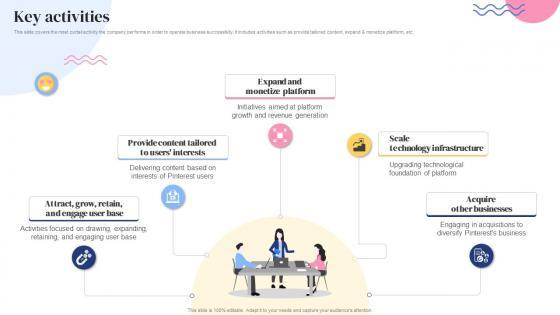 This slide covers the most curtail activity the company performs in order to operate business successfully. It includes activities such as provide tailored content, expand and monetize platform, etc. Get a simple yet stunning designed Key Activities Social Bookmarking Platform Business Model BMC SS V. It is the best one to establish the tone in your meetings. It is an excellent way to make your presentations highly effective. So, download this PPT today from Slidegeeks and see the positive impacts. Our easy-to-edit Key Activities Social Bookmarking Platform Business Model can be your go-to option for all upcoming conferences and meetings. So, what are you waiting for Grab this template today. This slide covers the most curtail activity the company performs in order to operate business successfully. It includes activities such as provide tailored content, expand and monetize platform, etc.