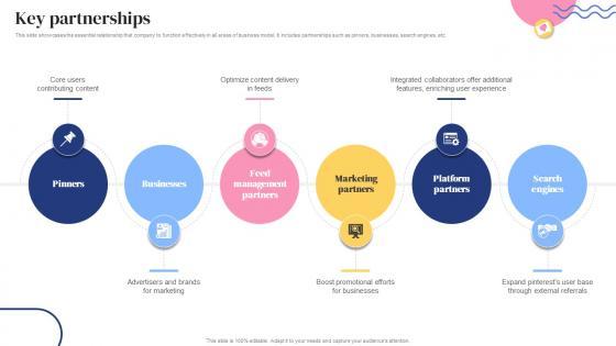 This slide showcases the essential relationship that company to function effectively in all areas of business model. It includes partnerships such as pinners, businesses, search engines, etc. Present like a pro with Key Partnerships Social Bookmarking Platform Business Model BMC SS V. Create beautiful presentations together with your team, using our easy-to-use presentation slides. Share your ideas in real-time and make changes on the fly by downloading our templates. So whether you are in the office, on the go, or in a remote location, you can stay in sync with your team and present your ideas with confidence. With Slidegeeks presentation got a whole lot easier. Grab these presentations today. This slide showcases the essential relationship that company to function effectively in all areas of business model. It includes partnerships such as pinners, businesses, search engines, etc.