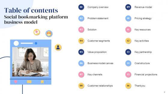 If you are looking for a format to display your unique thoughts, then the professionally designed Table Of Contents Social Bookmarking Platform Business Model BMC SS V is the one for you. You can use it as a Google Slides template or a PowerPoint template. Incorporate impressive visuals, symbols, images, and other charts. Modify or reorganize the text boxes as you desire. Experiment with shade schemes and font pairings. Alter, share or cooperate with other people on your work. Download Table Of Contents Social Bookmarking Platform Business Model and find out how to give a successful presentation. Present a perfect display to your team and make your presentation unforgettable. Our Table Of Contents Social Bookmarking Platform Business Model BMC SS V are topically designed to provide an attractive backdrop to any subject. Use them to look like a presentation pro.