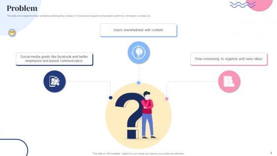 This slide showcases the major problems addressed by company. It includes text-based communication platforms, information overload, etc. Whether you have daily or monthly meetings, a brilliant presentation is necessary. Problem Social Bookmarking Platform Business Model can be your best option for delivering a presentation. Represent everything in detail using Problem Social Bookmarking Platform Business Model BMC SS V and make yourself stand out in meetings. The template is versatile and follows a structure that will cater to your requirements. All the templates prepared by Slidegeeks are easy to download and edit. Our research experts have taken care of the corporate themes as well. So, give it a try and see the results. This slide showcases the major problems addressed by company. It includes text-based communication platforms, information overload, etc.