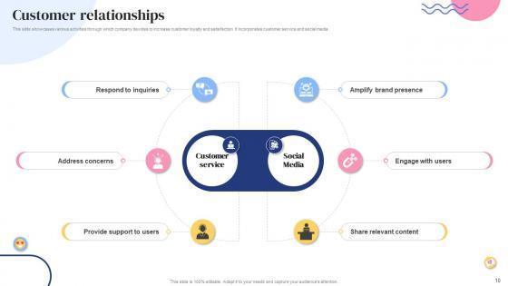 This slide showcases various activities through which company devotes to increase customer loyalty and satisfaction. It incorporates customer service and social media. Slidegeeks is one of the best resources for PowerPoint templates. You can download easily and regulate Customer Relationships Social Bookmarking Platform Business Model BMC SS V for your personal presentations from our wonderful collection. A few clicks is all it takes to discover and get the most relevant and appropriate templates. Use our Templates to add a unique zing and appeal to your presentation and meetings. All the slides are easy to edit and you can use them even for advertisement purposes. This slide showcases various activities through which company devotes to increase customer loyalty and satisfaction. It incorporates customer service and social media.