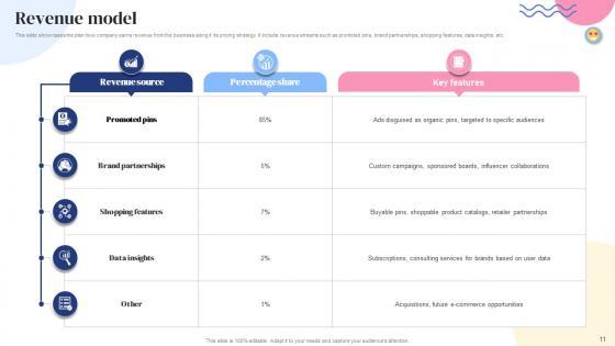 This slide showcases the plan how company earns revenue from the business along it its pricing strategy. It include revenue streams such as promoted pins, brand partnerships, shopping features, data insights, etc. Find highly impressive Revenue Model Social Bookmarking Platform Business Model BMC SS V on Slidegeeks to deliver a meaningful presentation. You can save an ample amount of time using these presentation templates. No need to worry to prepare everything from scratch because Slidegeeks experts have already done a huge research and work for you. You need to download Revenue Model Social Bookmarking Platform Business Model for your upcoming presentation. All the presentation templates are 100 percent editable and you can change the color and personalize the content accordingly. Download now This slide showcases the plan how company earns revenue from the business along it its pricing strategy. It include revenue streams such as promoted pins, brand partnerships, shopping features, data insights, etc.