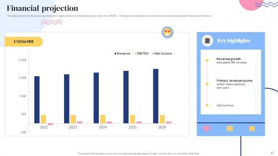 This slide presents the financial projections showcasing companys anticipated growth, net income, EBITDA. The projections are based on comprehensive market analysis and historical performance. There are so many reasons you need a Financial Projection Social Bookmarking Platform Business Model BMC SS V. The first reason is you can not spend time making everything from scratch, Thus, Slidegeeks has made presentation templates for you too. You can easily download these templates from our website easily. This slide presents the financial projections showcasing companys anticipated growth, net income, EBITDA. The projections are based on comprehensive market analysis and historical performance.