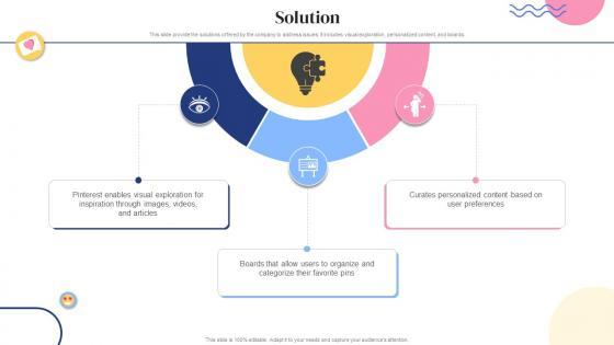 This slide provide the solutions offered by the company to address issues. It includes visual exploration, personalized content, and boards. If your project calls for a presentation, then Slidegeeks is your go-to partner because we have professionally designed, easy-to-edit templates that are perfect for any presentation. After downloading, you can easily edit Solution Social Bookmarking Platform Business Model BMC SS V and make the changes accordingly. You can rearrange slides or fill them with different images. Check out all the handy templates This slide provide the solutions offered by the company to address issues. It includes visual exploration, personalized content, and boards.