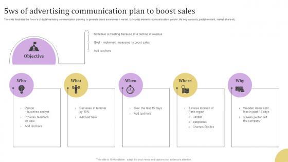 This slide illustrates the five ws of digital marketing communication planning to generate brand awareness in market. It includes elements such as location, gender, life long warranty, publish content , market share etc. Pitch your topic with ease and precision using this 5ws Of Advertising Communication Plan To Boost Sales Infographics Pdf. This layout presents information on Provides Feedback, Business Analyst, Stores Location. It is also available for immediate download and adjustment. So, changes can be made in the color, design, graphics or any other component to create a unique layout. This slide illustrates the five ws of digital marketing communication planning to generate brand awareness in market. It includes elements such as location, gender, life long warranty, publish content , market share etc.