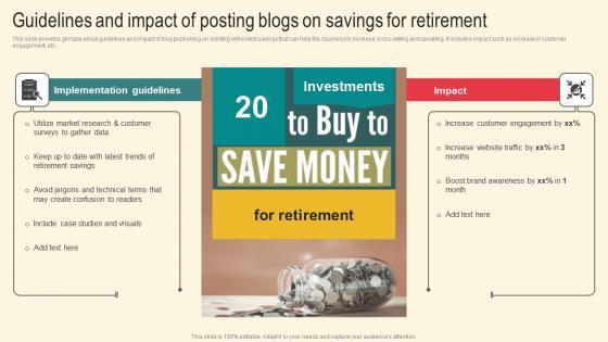 This slide provides glimpse about guidelines and impact of blog publishing on building retirement savings that can help the business to increase cross selling and upselling. It includes impact such as increase in customer engagement, etc. Slidegeeks is here to make your presentations a breeze with Guidelines And Impact Posting Marketing Plan For Boosting Client Retention In Retail Banking Introduction Pdf With our easy to use and customizable templates, you can focus on delivering your ideas rather than worrying about formatting. With a variety of designs to choose from, you are sure to find one that suits your needs. And with animations and unique photos, illustrations, and fonts, you can make your presentation pop. So whether you are giving a sales pitch or presenting to the board, make sure to check out Slidegeeks first This slide provides glimpse about guidelines and impact of blog publishing on building retirement savings that can help the business to increase cross selling and upselling. It includes impact such as increase in customer engagement, etc.