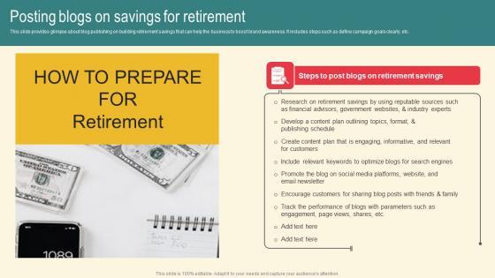 This slide provides glimpse about blog publishing on building retirement savings that can help the business to boost brand awareness. It includes steps such as define campaign goals clearly, etc. Presenting this PowerPoint presentation, titled Posting Blogs On Savings Marketing Plan For Boosting Client Retention In Retail Banking Rules Pdf, with topics curated by our researchers after extensive research. This editable presentation is available for immediate download and provides attractive features when used. Download now and captivate your audience. Presenting this Posting Blogs On Savings Marketing Plan For Boosting Client Retention In Retail Banking Rules Pdf. Our researchers have carefully researched and created these slides with all aspects taken into consideration. This is a completely customizable Posting Blogs On Savings Marketing Plan For Boosting Client Retention In Retail Banking Rules Pdf that is available for immediate downloading. Download now and make an impact on your audience. Highlight the attractive features available with our PPTs. This slide provides glimpse about blog publishing on building retirement savings that can help the business to boost brand awareness. It includes steps such as define campaign goals clearly, etc.