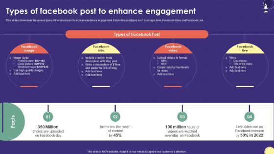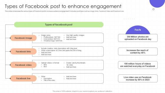This slides showcases the various types of Facebook post to increase audience engagement. It includes post types such as image, links, Facebook Video and Facebook Live.From laying roadmaps to briefing everything in detail, our templates are perfect for you. You can set the stage with your presentation slides. All you have to do is download these easy-to-edit and customizable templates. Types Of Facebook Post To Enhance Engagement Regional Marketing Plan To Boost Sales MKT SS will help you deliver an outstanding performance that everyone would remember and praise you for. Do download this presentation today. This slides showcases the various types of Facebook post to increase audience engagement. It includes post types such as image, links, Facebook Video and Facebook Live.