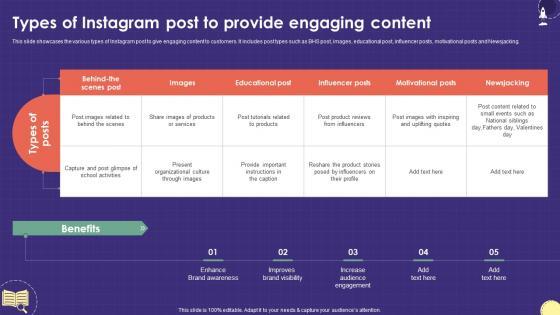 This slide showcases the various types of Instagram post to give engaging content to customers. It includes post types such as BHS post, images, educational post, influencer posts, motivational posts and Newsjacking. This modern and well-arranged Types Of Instagram Post To Provide Engaging Marketing Plan For Boosting School Strategy SS V provides lots of creative possibilities. It is very simple to customize and edit with the Powerpoint Software. Just drag and drop your pictures into the shapes. All facets of this template can be edited with Powerpoint, no extra software is necessary. Add your own material, put your images in the places assigned for them, adjust the colors, and then you can show your slides to the world, with an animated slide included. This slide showcases the various types of Instagram post to give engaging content to customers. It includes post types such as BHS post, images, educational post, influencer posts, motivational posts and Newsjacking.