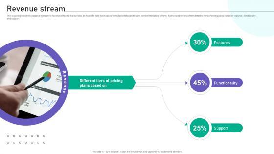 The following slide showcases a companys revenue streams that develop software to help businesses formulate strategies to tailor content marketing efforts. It generates revenue from different tiers of pricing plans varies in features, functionality and support. This modern and well-arranged Revenue Stream Website Traffic Boosting Tool Investor Funding Elevator Pitch Deck provides lots of creative possibilities. It is very simple to customize and edit with the Powerpoint Software. Just drag and drop your pictures into the shapes. All facets of this template can be edited with Powerpoint, no extra software is necessary. Add your own material, put your images in the places assigned for them, adjust the colors, and then you can show your slides to the world, with an animated slide included. The following slide showcases a companys revenue streams that develop software to help businesses formulate strategies to tailor content marketing efforts. It generates revenue from different tiers of pricing plans varies in features, functionality and support.
